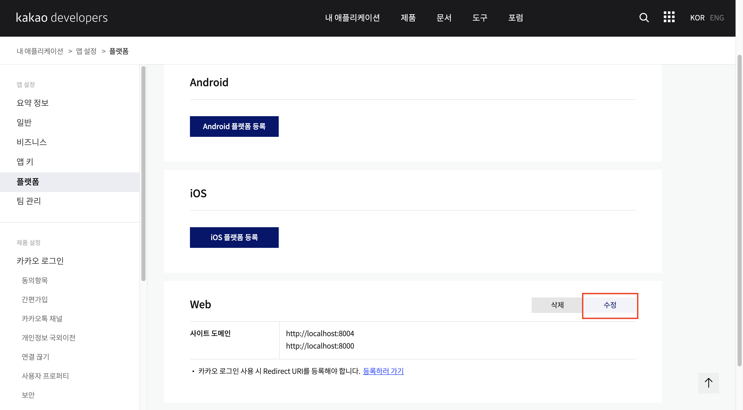 local에서 테스트해볼거기때문에 localhost:8000 (본인이 설정한 도메인주소)로 등록