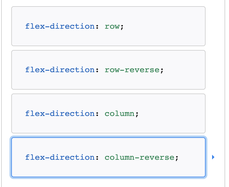 flex-direction - 로우식, 컬럼식으로 설정가능하고 default는 row이므로 column으로 사용하려면 이렇게 설정변경해준다. reverse로도 셋팅이 가능하다.
