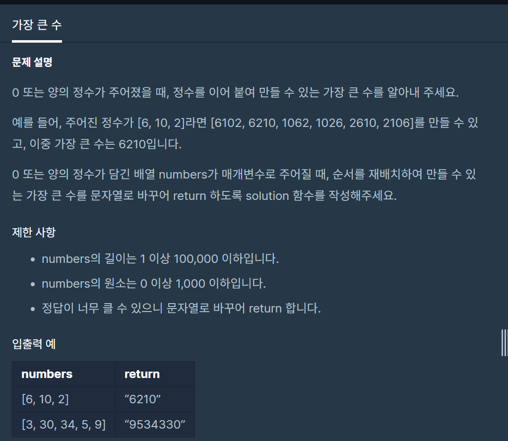 정렬을 하였으면 가장 앞자리가 큰 숫자가 arr[0]에 담기게 되는데 0이라는 것의 의미는 숫자가 0000 처럼 0으로만 구성되었다는 의미이므로 0을 return 해줍니다.